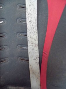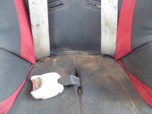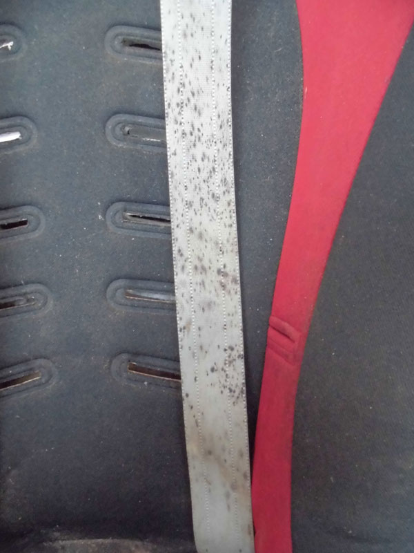 肩ベルトには広範囲にカビが、シートには全体的にシミがあります。