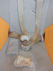 チャイルドシートの肩ベルトとお尻の下部分にあたる所に、シミが見えます。