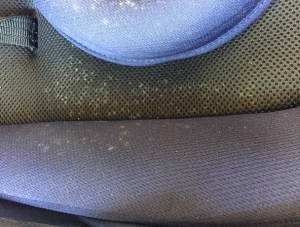 泥ハネ汚れ、ベルトの汚れ、シートに発生したカビなどが見られます。