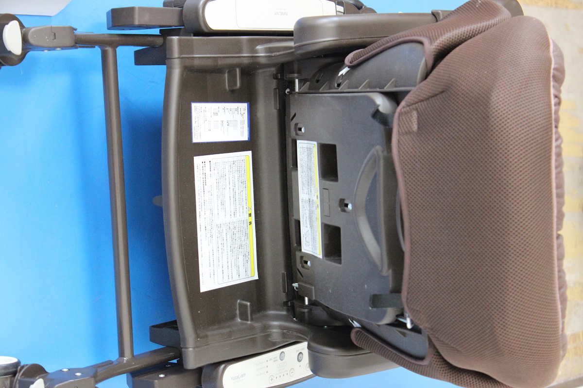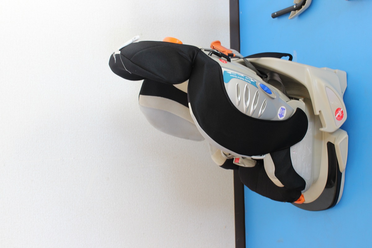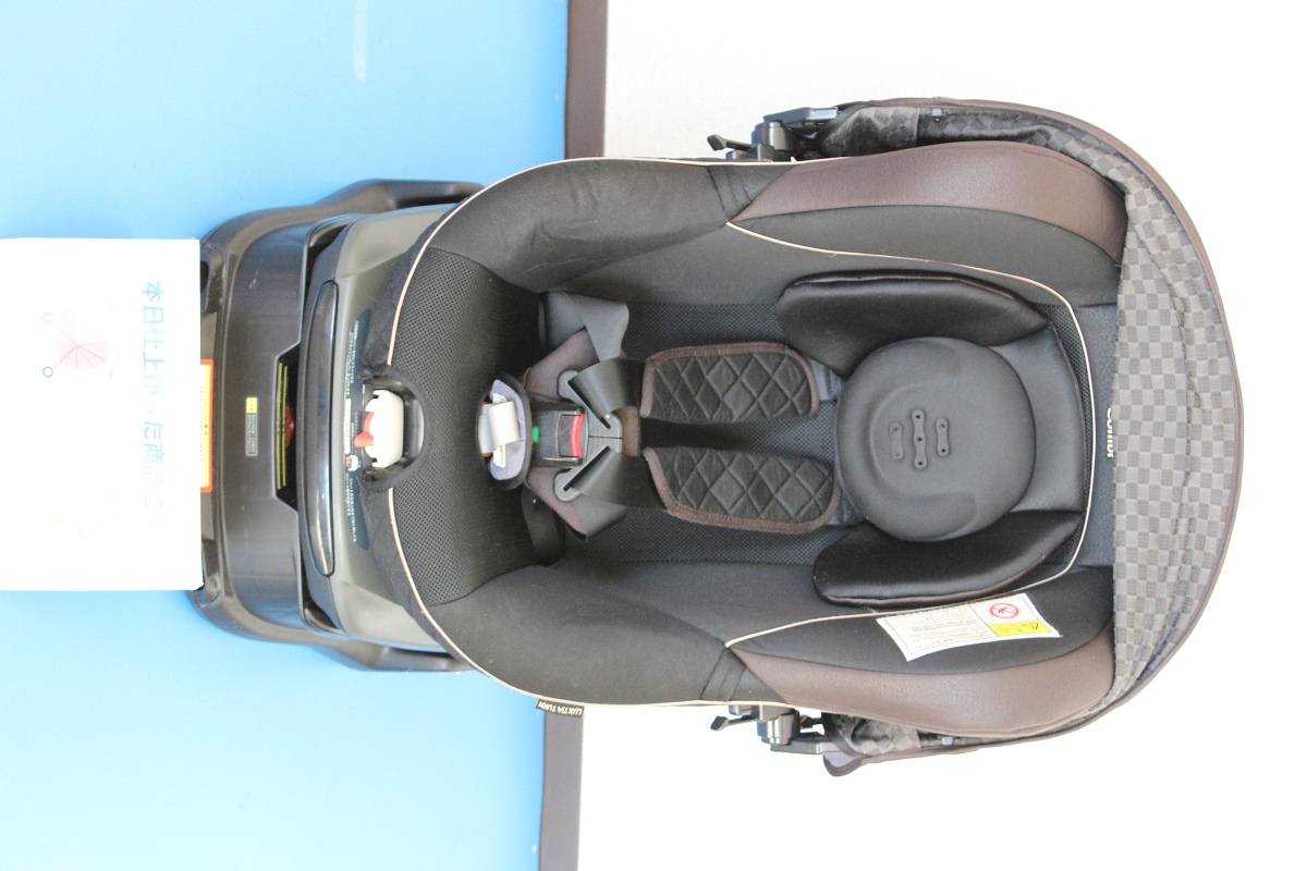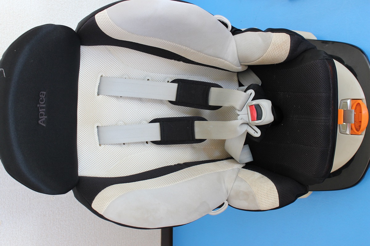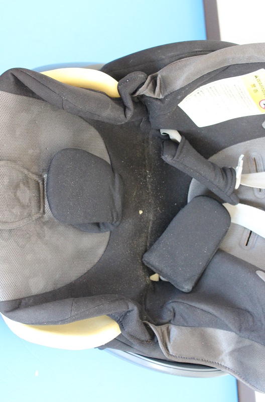 こちらのチャイルドシートは一見きれいに見えますが、よく見ると座面部分のシミ汚れや白いヘッドパットの黄ばみなどが見えますね。