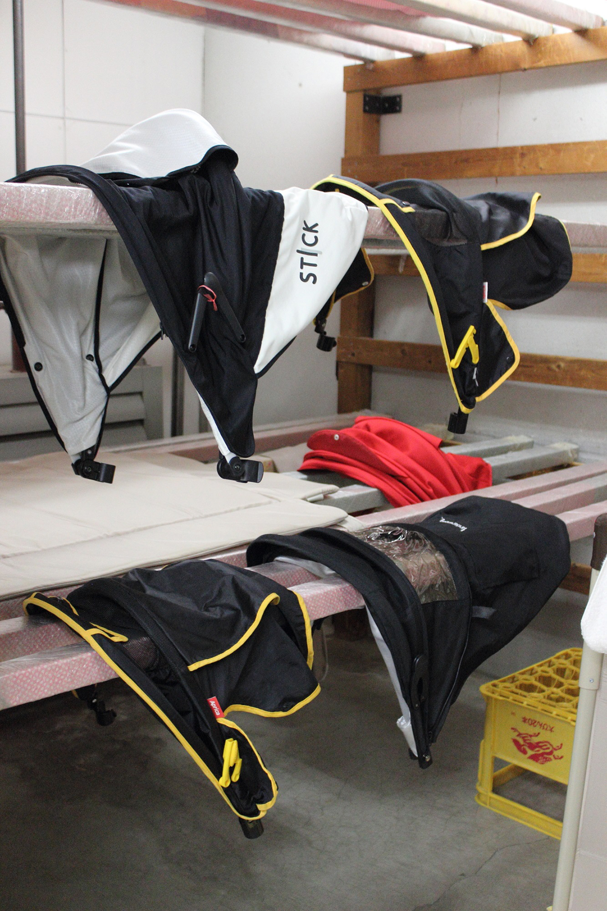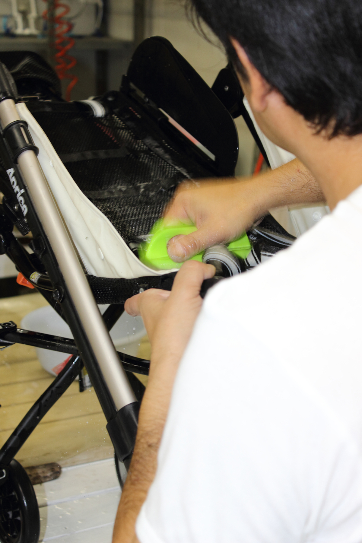 またお客様の商品はひとつひとつ一点、一点手洗いを行っています。さらにコンプレッサーを使ってチャイルドシートやベビーラックではすき間に挟まったゴミや食べ物カスなどを飛ばしたり、ベビーカーでは洗浄後の水滴を飛ばしたりしています。ベビーカーのホイールは当店のクリーニングでも時間をかけており、ブラシを使い分けて細かい部分まで丁寧に洗浄して汚れを落とします。